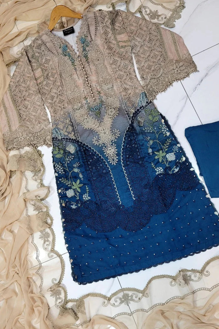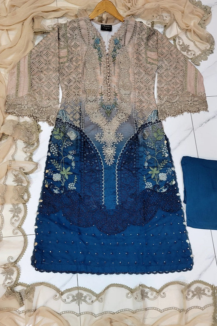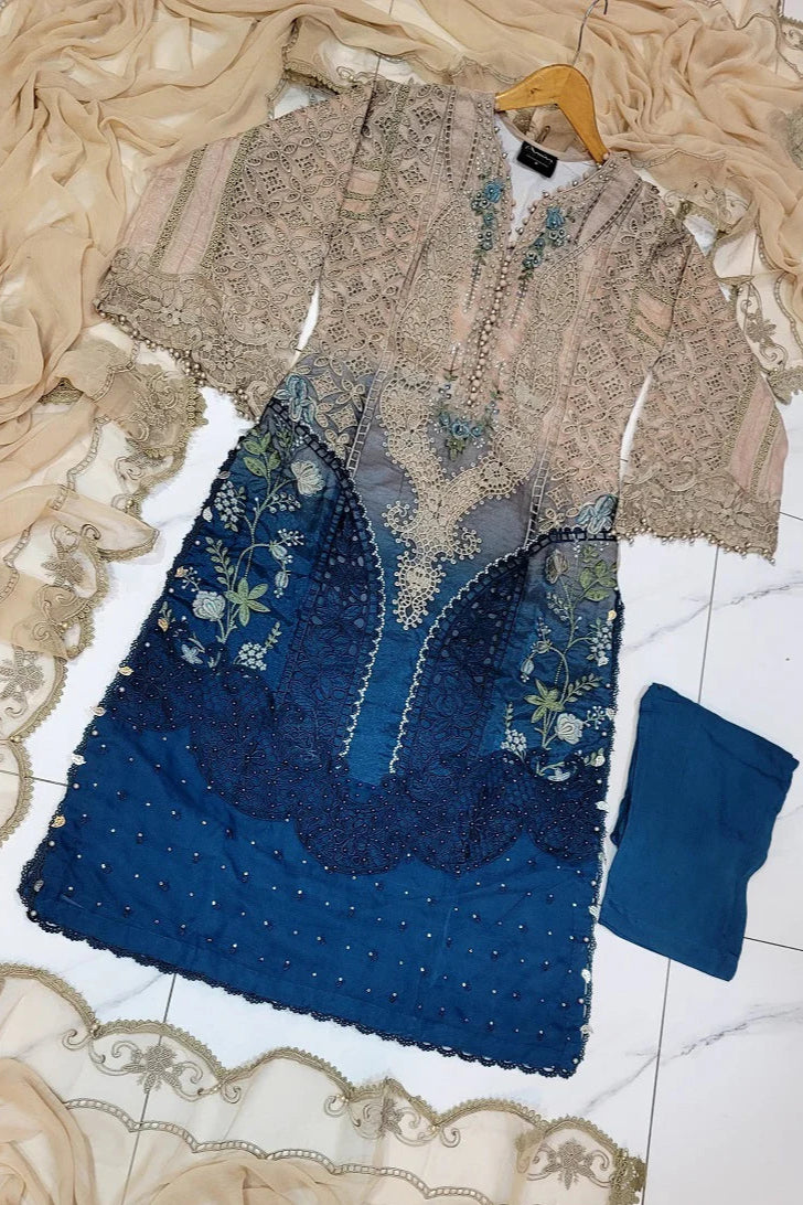 This refined ensemble features a straight shirt made from premium organza, paired with soft viscose trousers and a lightweight chiffon dupatta. With a shirt length of 46 to 48 inches, the outfit offers a clean, elegant silhouette that’s perfect for both formal gatherings and semi-formal occasions. Weighing 1.050 kg, the outfit provides just the right balance of structure and comfort, making it a sophisticated addition to any wardrobe.