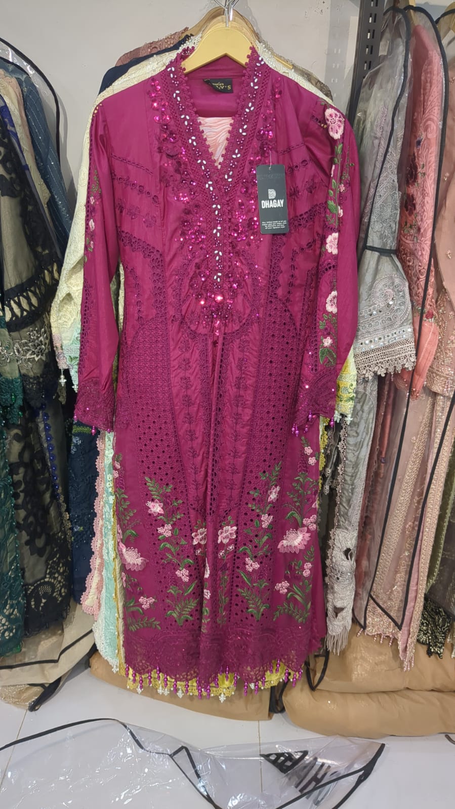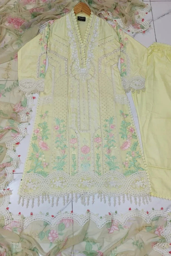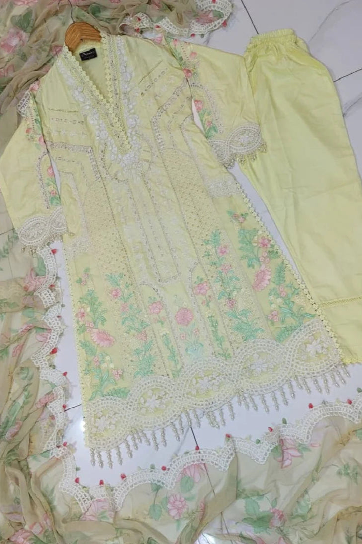 Elevate your wardrobe with this graceful 3-piece ensemble, featuring an A-line shirt and trousers made from luxurious Katan silk. The flowing A-line silhouette offers a flattering fit, with a shirt length of 47 to 49 inches, ideal for formal and festive occasions. Completing the look is a vibrant digital printed chiffon dupatta, adding a touch of modern flair and color contrast. Weighing just 0.900 kg, this outfit is designed for comfort and elegance, making it a perfect choice for events where style matters.