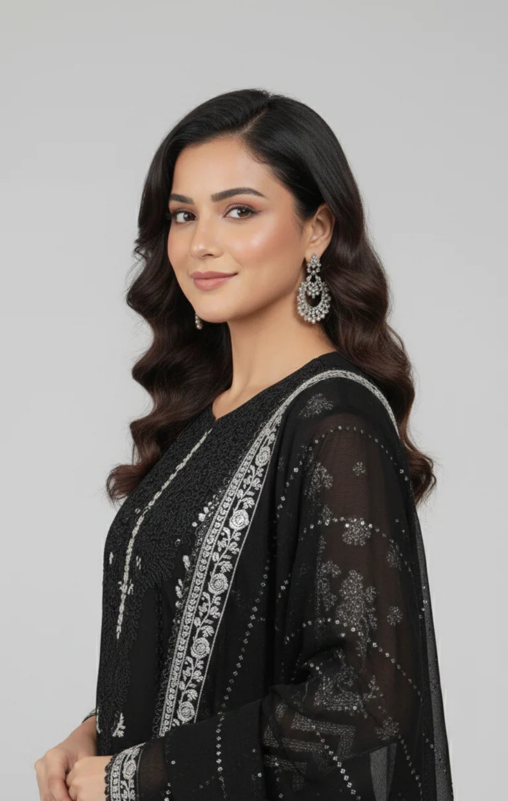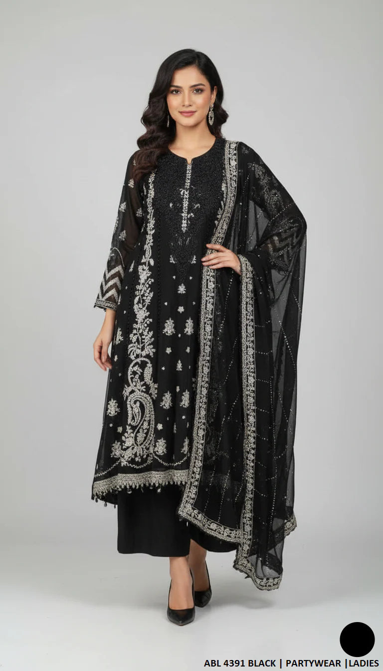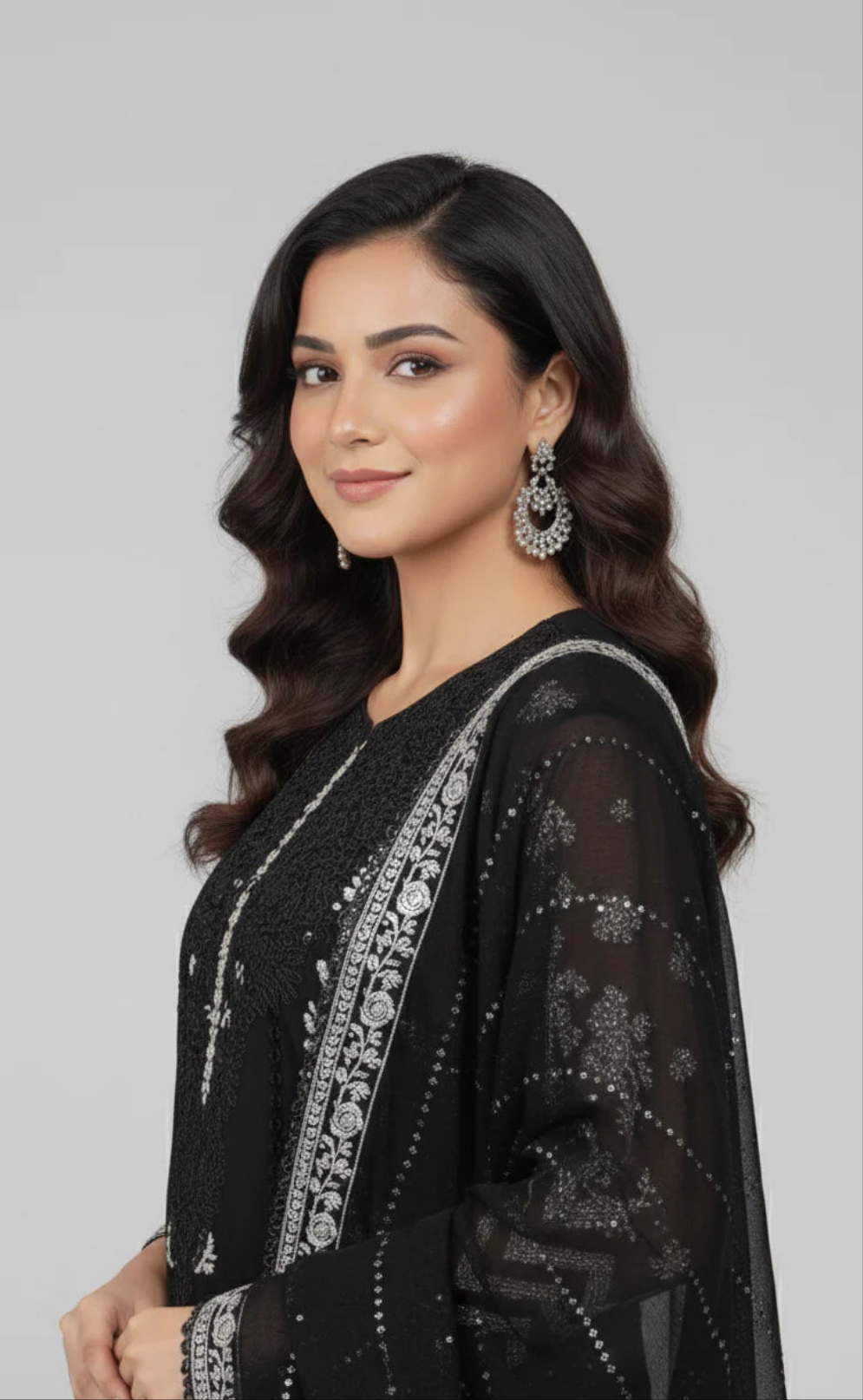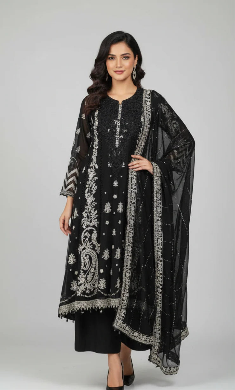 This beautifully designed outfit features a chiffon A-line frock paired with comfortable viscose trousers and a matching chiffon dupatta. The A-line silhouette offers a graceful flow, while the shirt length ranges from 40 to 42 inches, ensuring a flattering fit. With an overall weight of approximately 1.300 kg, this ensemble provides a perfect balance of elegance and comfort.