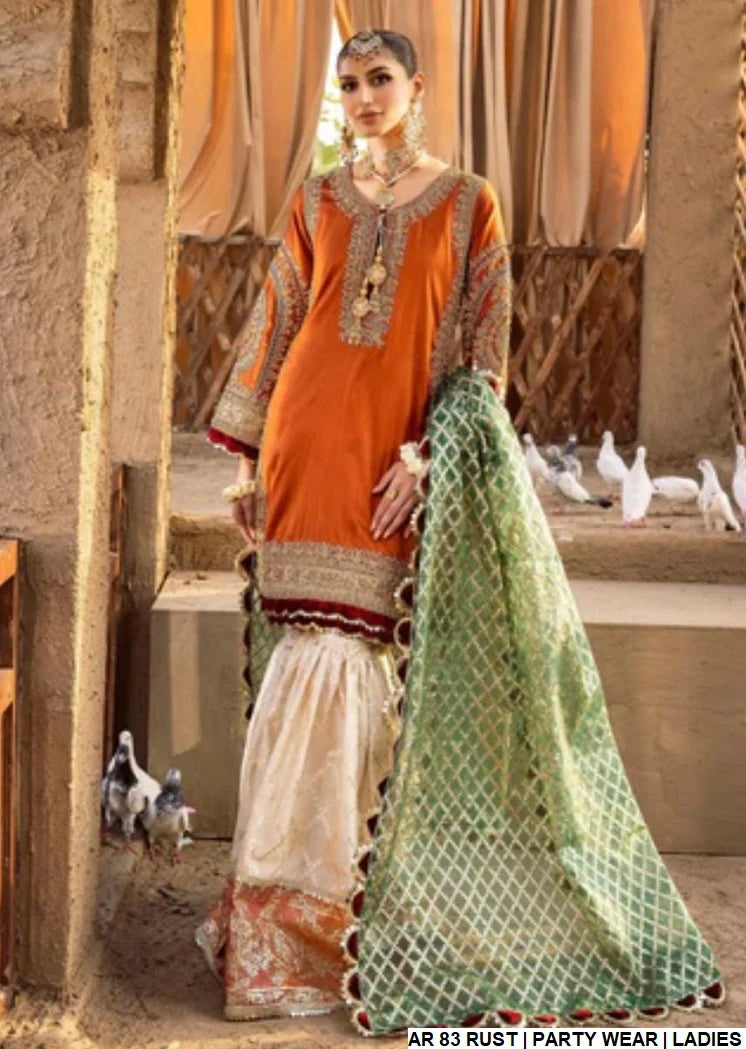 This stylish and elegant ensemble is a luxurious fusion of traditional craftsmanship and contemporary charm. The shirt is made from premium raw silk, offering a rich and graceful appeal. Paired with a beautifully flared gharara in exquisite masuri fabric, the outfit exudes royal elegance. The masuri net dupatta adds a soft, ethereal touch, completing the look with refined sophistication. With a shirt length of 33 to 35 inches, this ensemble is perfect for those seeking traditional wear with a modern twist. Weighing approximately 1.65 kg and adorned with intricate work, this outfit is an ideal pick for festive and special occasions.