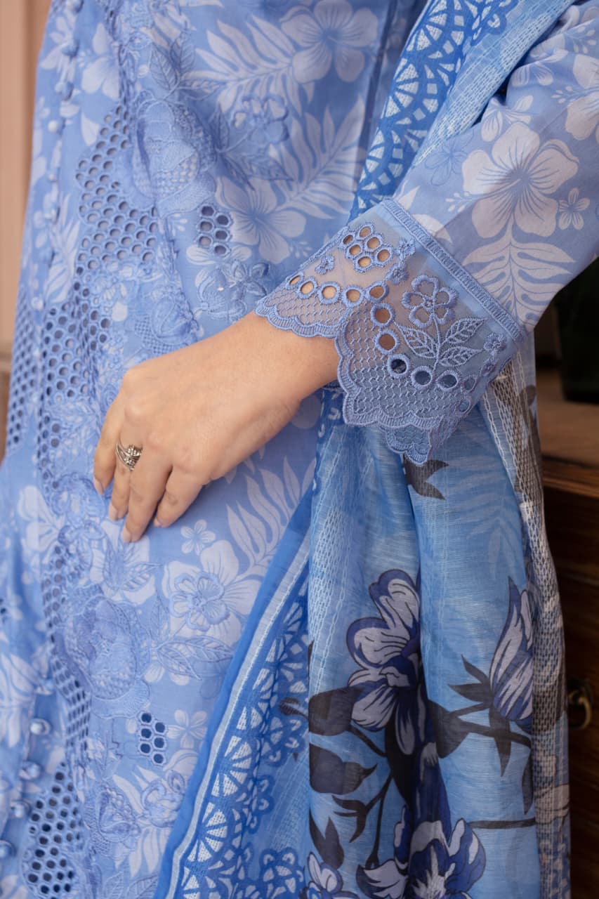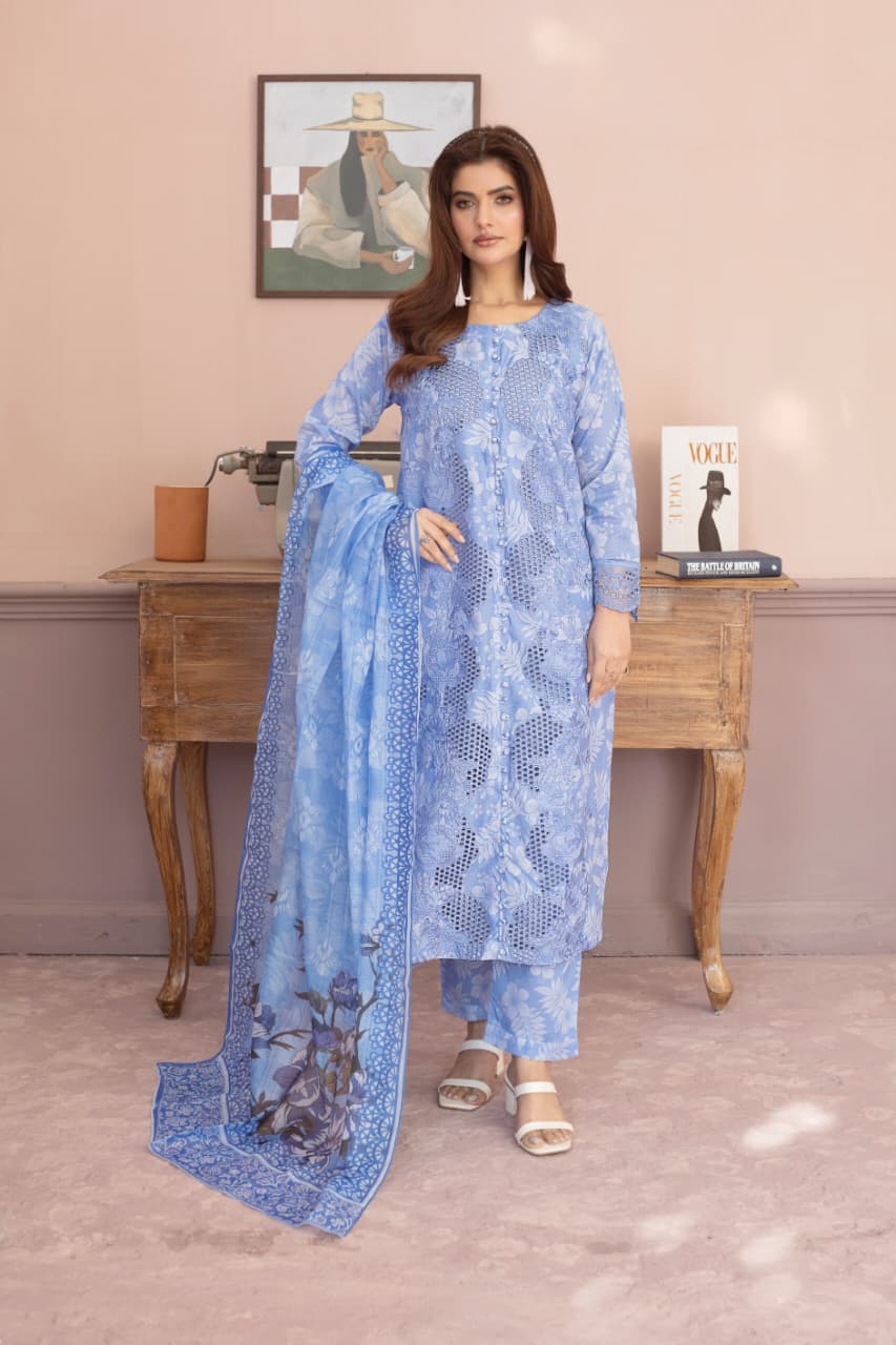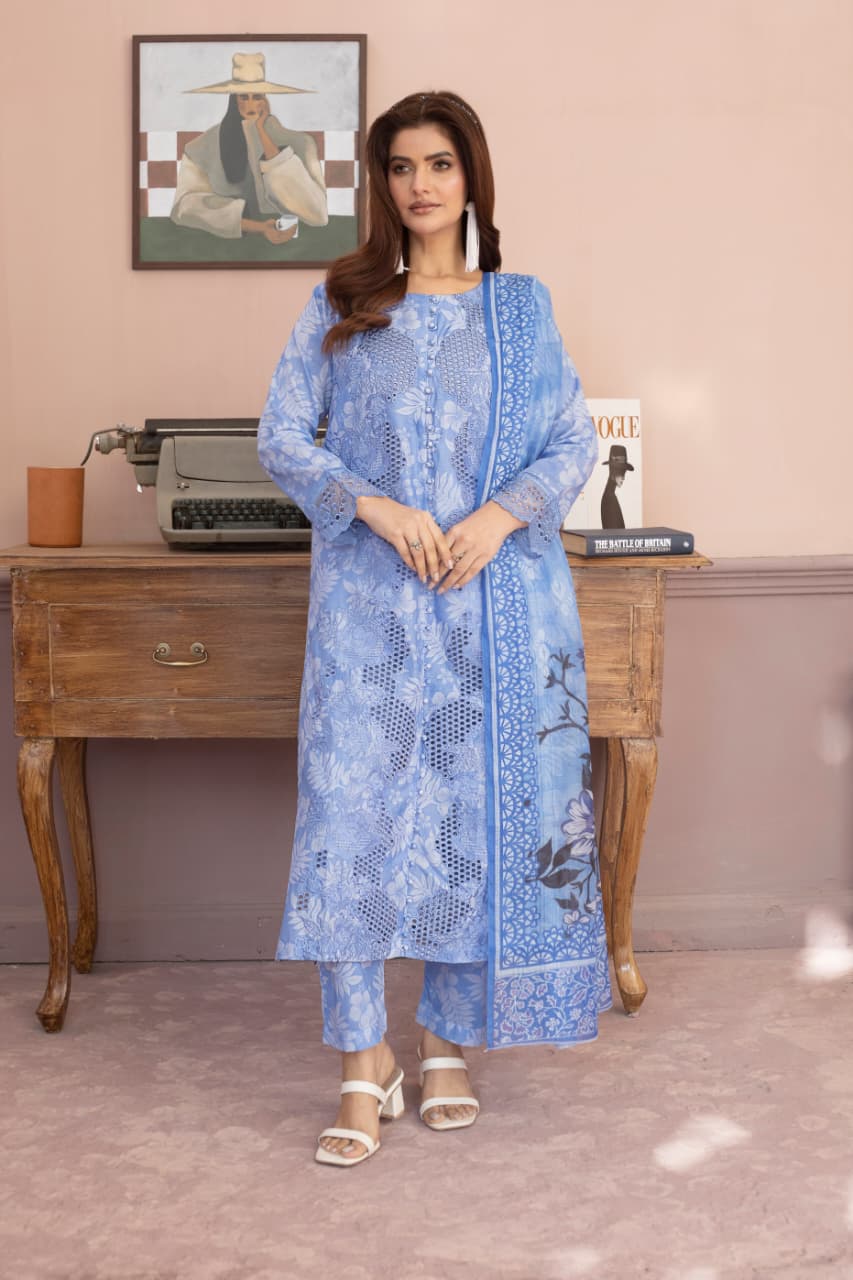 The item is a light blue, three-piece Eastern-style suit, typically made from lawn fabric, featuring digital printing and embroidery. It is a ready-to-wear or unstitched outfit suitable for the summer season.