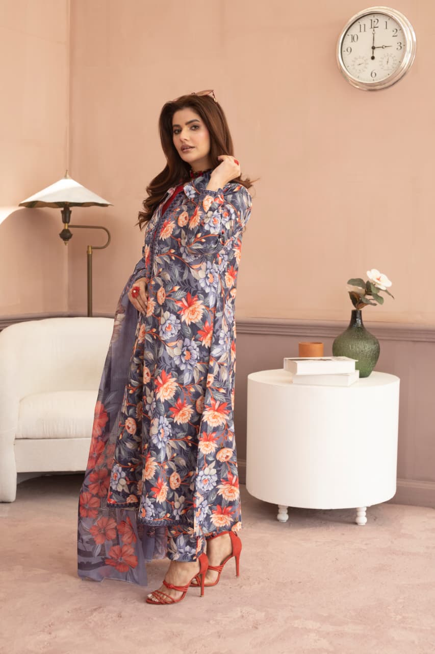 Design: Features an all-over, dense floral print in attractive shades of blue, grey, and red on the outer coat and trousers.