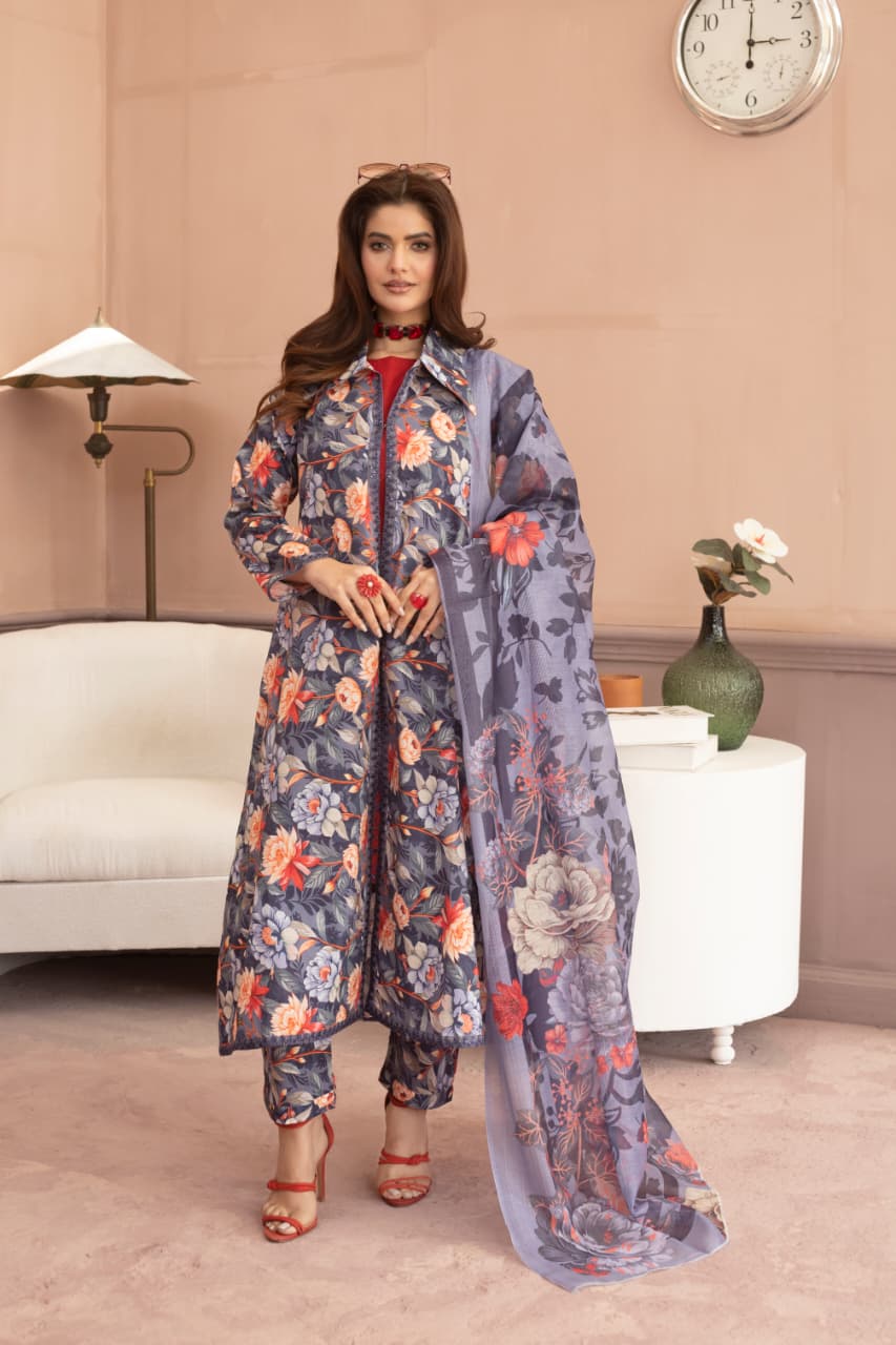 Step out in style with this elegant and vibrant three-piece co-ord set, perfect for a casual outing or semi-formal event. The breathable fabric ensures all-day comfort while the unique floral print makes a bold fashion statement. This ensemble offers a seamless blend of traditional charm and contemporary design.