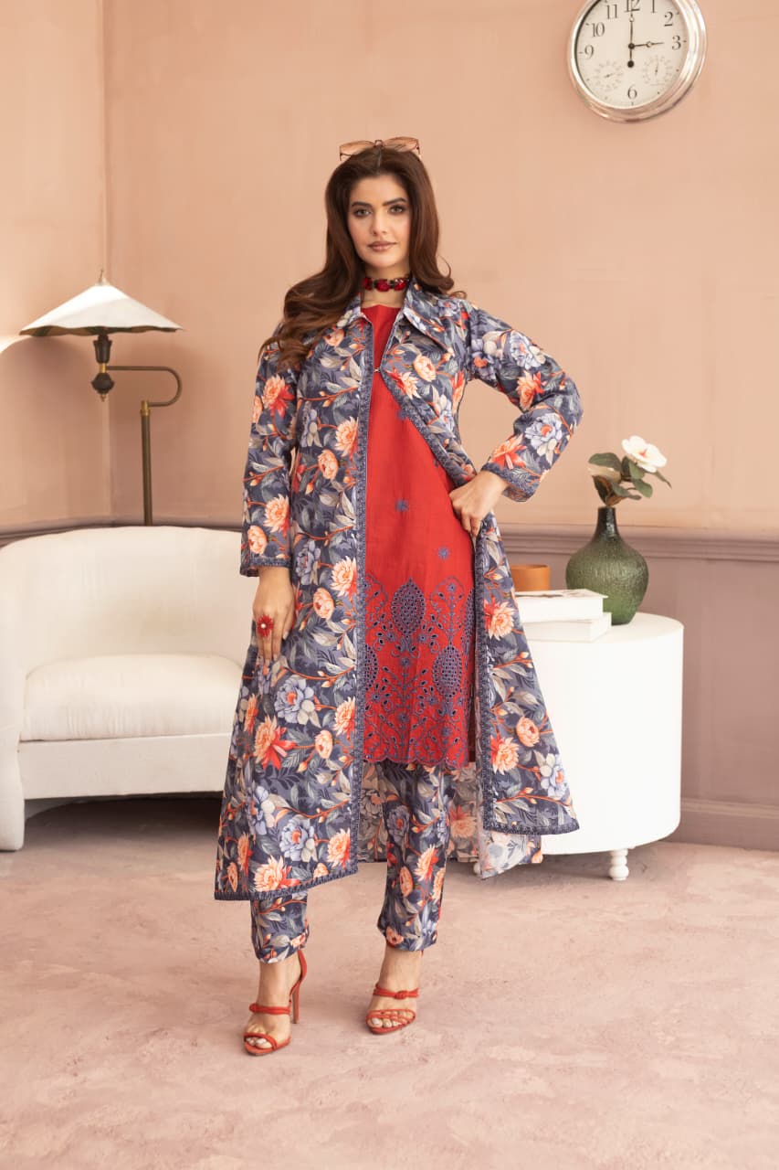 Floral Blue & Red Co-Ord Set | 3-Piece Women's Suit