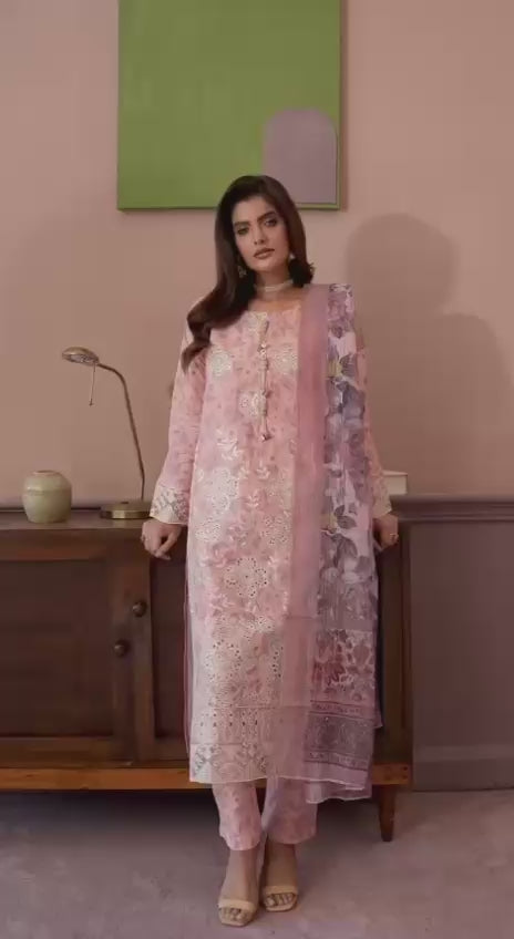Description: Dive into sophistication with this exquisite 3-piece lawn suit set in a lovely peach/pink hue.
