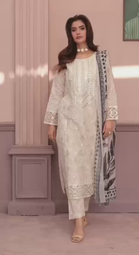 Elevate a traditional wardrobe with this stunning white ensemble, perfect for festive occasions or elegant gatherings. This three-piece suit features intricate embroidery and delicate embellishments, offering a sophisticated and timeless look.