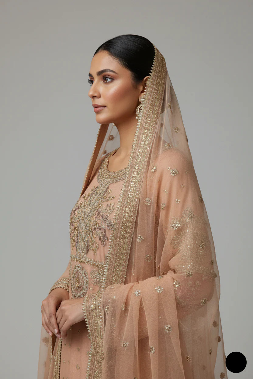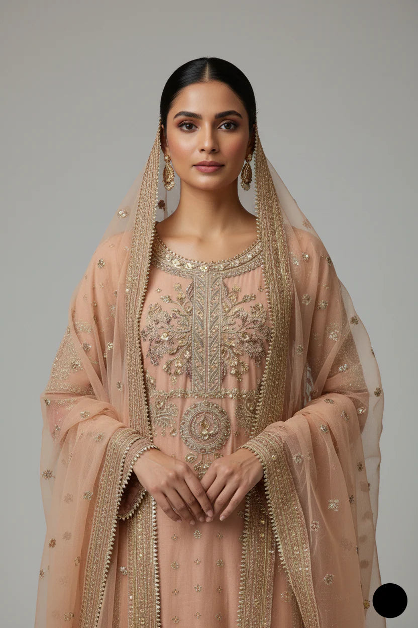 - The outfit features a shirt made from chiffon fabric, paired with trousers also crafted from chiffon fabric, and a dupatta made from organza fabric. The style of the ensemble is a straight shirt with plaazo trousers, offering a sleek and modern look. The shirt has a length of 44/46, providing a tailored and comfortable fit. The total weight of the outfit is 1.200 kg, making it lightweight yet elegant. The combination of soft, flowing chiffon and the delicate organza dupatta creates a perfect balance of sophistication and contemporary style, ideal for a chic and graceful appearance.