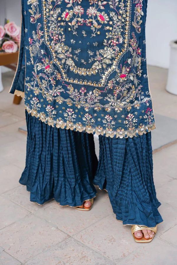 A chiffon shirt with attached sleeves, beautifully adorned with delicate sequins, pearls, and fine thread embroidery, adding a graceful shimmer to the look. Paired with a flowy crushed sharara that creates a playful, voluminous touch and a matching chiffon dupatta that drapes elegantly, this outfit is designed for festive sophistication and charm.
