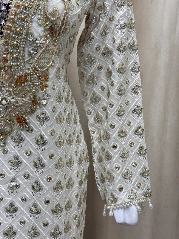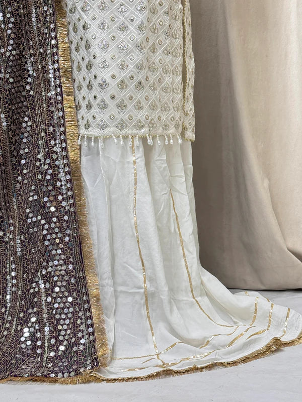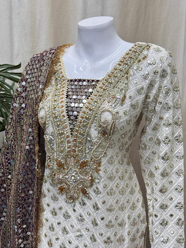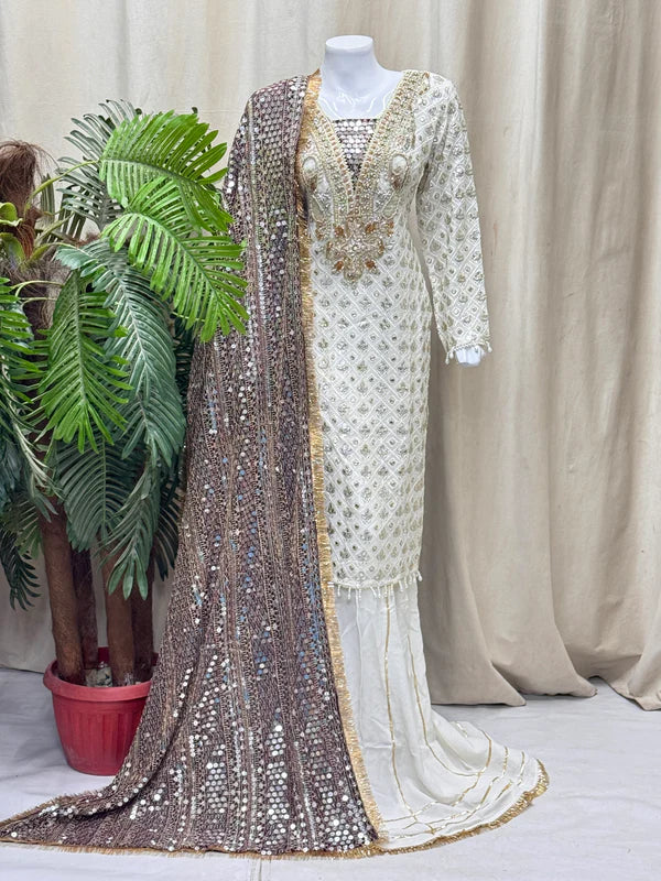 This graceful outfit features a straight-cut chiffon shirt paired with a stylish plazo trouser, delivering a perfect blend of elegance and comfort. The lightweight chiffon fabric adds a delicate and flowing appearance, while the grip trouser provides a relaxed yet polished look. A matching chiffon dupatta complements the set, making it ideal for semi-formal to festive occasions. With a flattering shirt length of 41/43 and a total outfit weight of 1.250 kg, it ensures effortless style without compromising comfort.