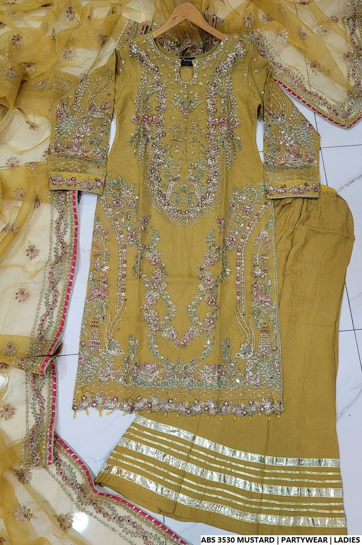This refined three‑piece ensemble features an organza straight‑cut shirt with a graceful flare for the plazo made in comfortably structured grip fabric. Completing the look is a matching organza dupatta that balances its sheer elegance with subtle heft. With a length of 45–47 inches and a total fabric weight of approximately 1.100 kg, the outfit delivers both sophistication and ease. This popular organza‑plus‑grip combination is widely embraced by Pakistani formal wear brands such as Maryams, known for its organza shirt with dyed grip trousers and dupatta pieces.