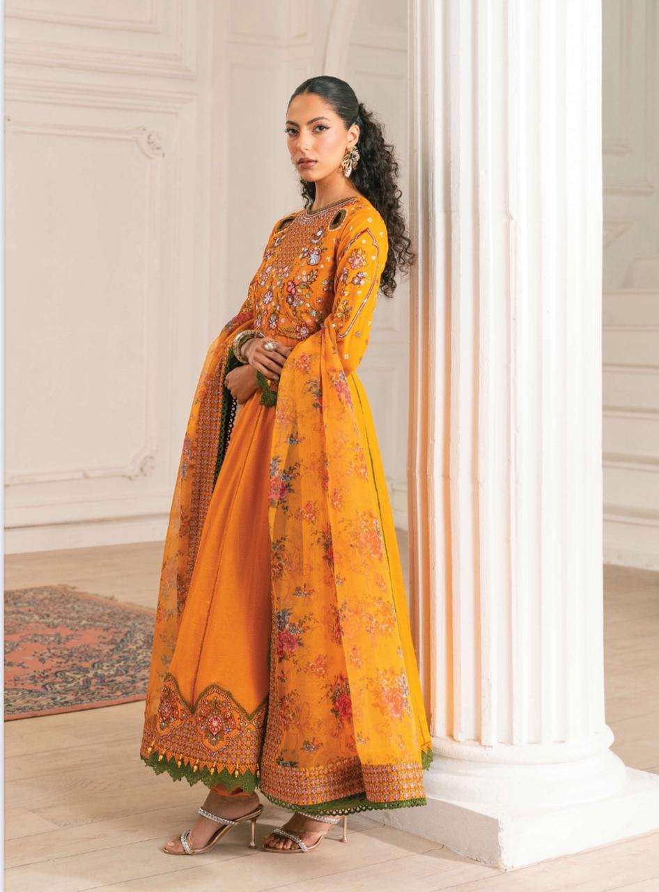 This vibrant mustard outfit features delicate cutwork embroidery paired with elegant ivory and multi-color detailing for a classic traditional look. Styled with a churidar pajama and finished with a beautifully printed pure organza dupatta, it’s a perfect choice for Eid and festive celebrations.